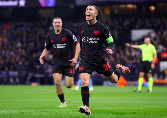 即便如此,曼城还是明显占据了场面上的主动权,但率先进球的却是勒沃库森,第20分钟,阿莱克斯·加西亚传中,科法内标志性地回做停球,边后卫格里马尔多一脚怒射,打破僵局。