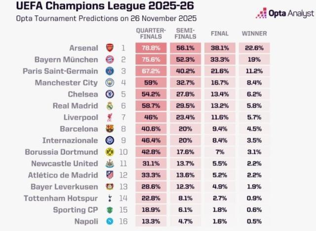 OPTA更新欧冠夺冠概率:阿森纳22.6%居首